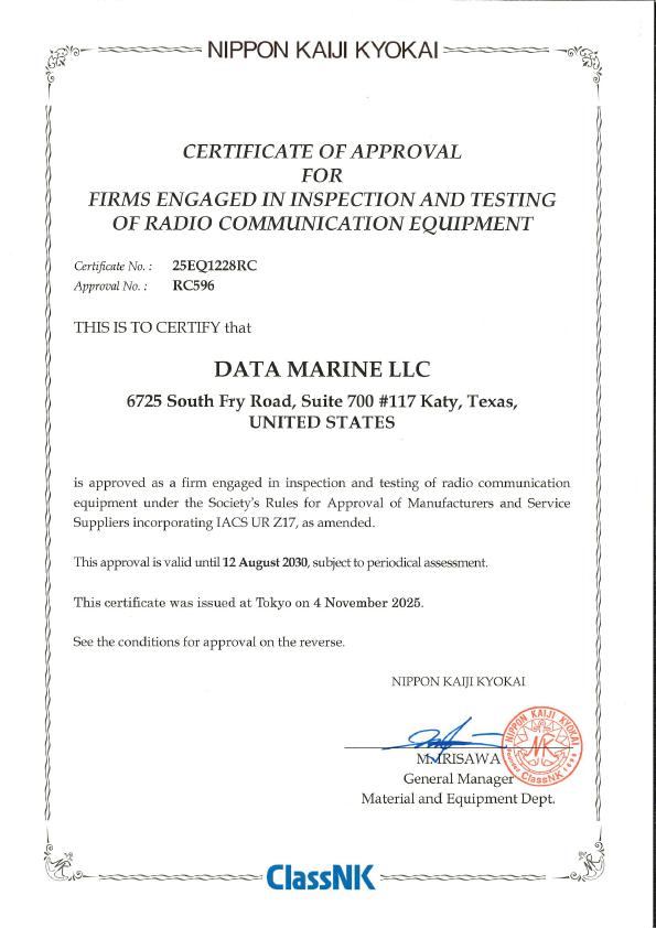 DATA MARINE LLC, which serves in Texas, and around ports, conducts your GMDSS Annual Radio Survey and performance tests. Our Company is approved by the IACS Classes. For approval certificates, please CLICK here.